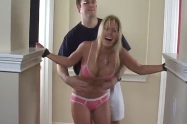 まだ昼間っから下着姿で旦那にコチョコチョとくすぐられるセクシー妻ww 両手でガードして守れない無防備な状態で、弱点の脇腹をモミモミされたらひとたまりもありません。