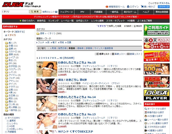 DUGAは、私が知る限りで最も「無料のくすぐり動画サンプル数」が多いアダルトサイトです。あのくすぐり界の巨匠、松下さんの作品も大量にあります。老舗の超有名大手サイトですので、くすぐり好きは絶対にチェックしておいて損はないです。