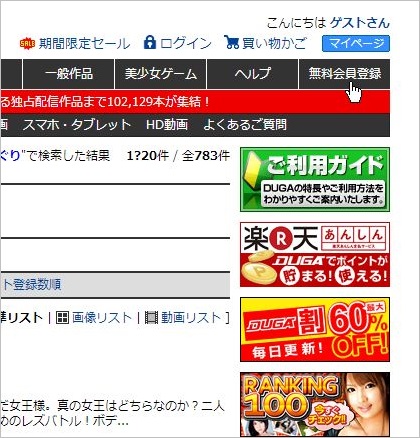DUGAは会員登録をしなくても、1日3つまでなら無料サンプル動画を視聴できます。さらに会員登録をすれば、1日いくつでも、回数無制限でくすぐり動画の無料サンプルを閲覧できます。