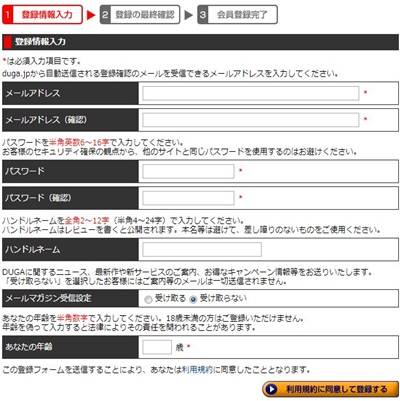 メールアドレス、パスワード、ハンドルネーム、年齢を入力します。