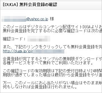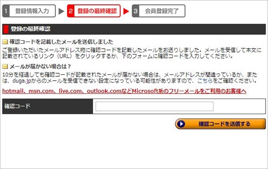このメールに記載されている「確認コード」を、もう一度DUGAのサイトで登録します。