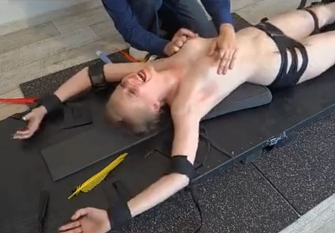 恥ずかしいしくすぐったいのに抵抗できない状態というのは、かなりきつそうです。さらに男は次に電動歯ブラシを取り出して、脇の下や上半身のくすぐり責めを開始します。さらに2つの電動歯ブラシで、胸の先端をイジメられて、くすぐったいやら気持ちいいやらでおかしくなりそうです。